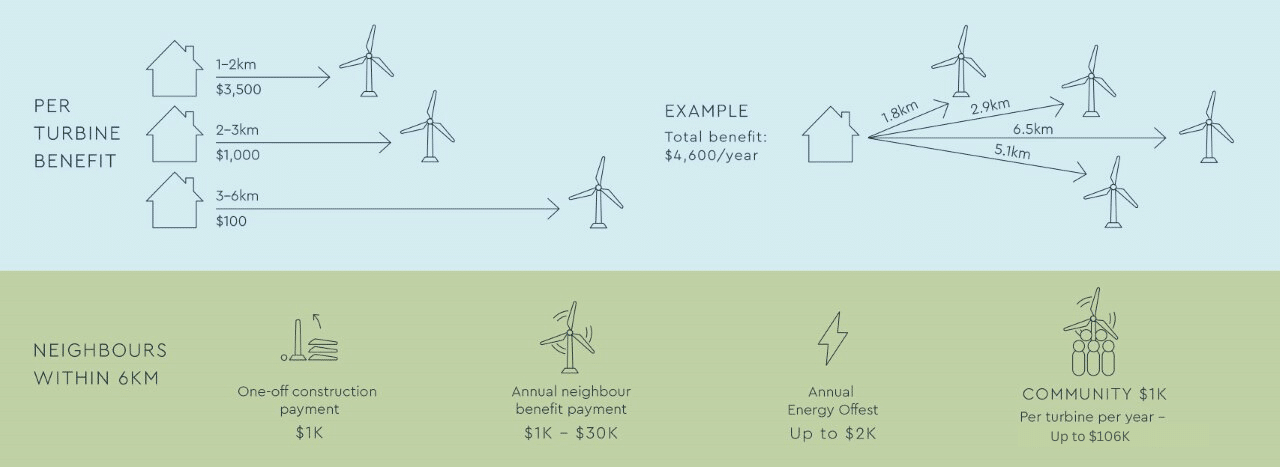 Wind Prospect would like to thank everyone who provided their feedback. This input has helped shape the revised Neighbour Benefit Sharing Program, which aims to ensure the financial benefits of the Project would be shared with residents living closest to the wind farm. The Program would commence at the commissioning of the wind farm and continue annually for as long as the relevant turbines are operational.